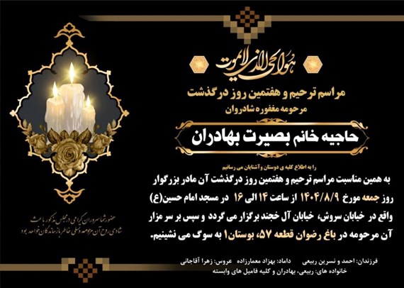 با نهایت تاسف درگذشت مادر بزرگوارتان را به جنابعالی و خانواده محترم تسلیت عرض نموده ، از درگاه احدیت برای آن مرحومه شادی روح و آمرزش و برای بازماندگان محترم صبر آرزومندیم.